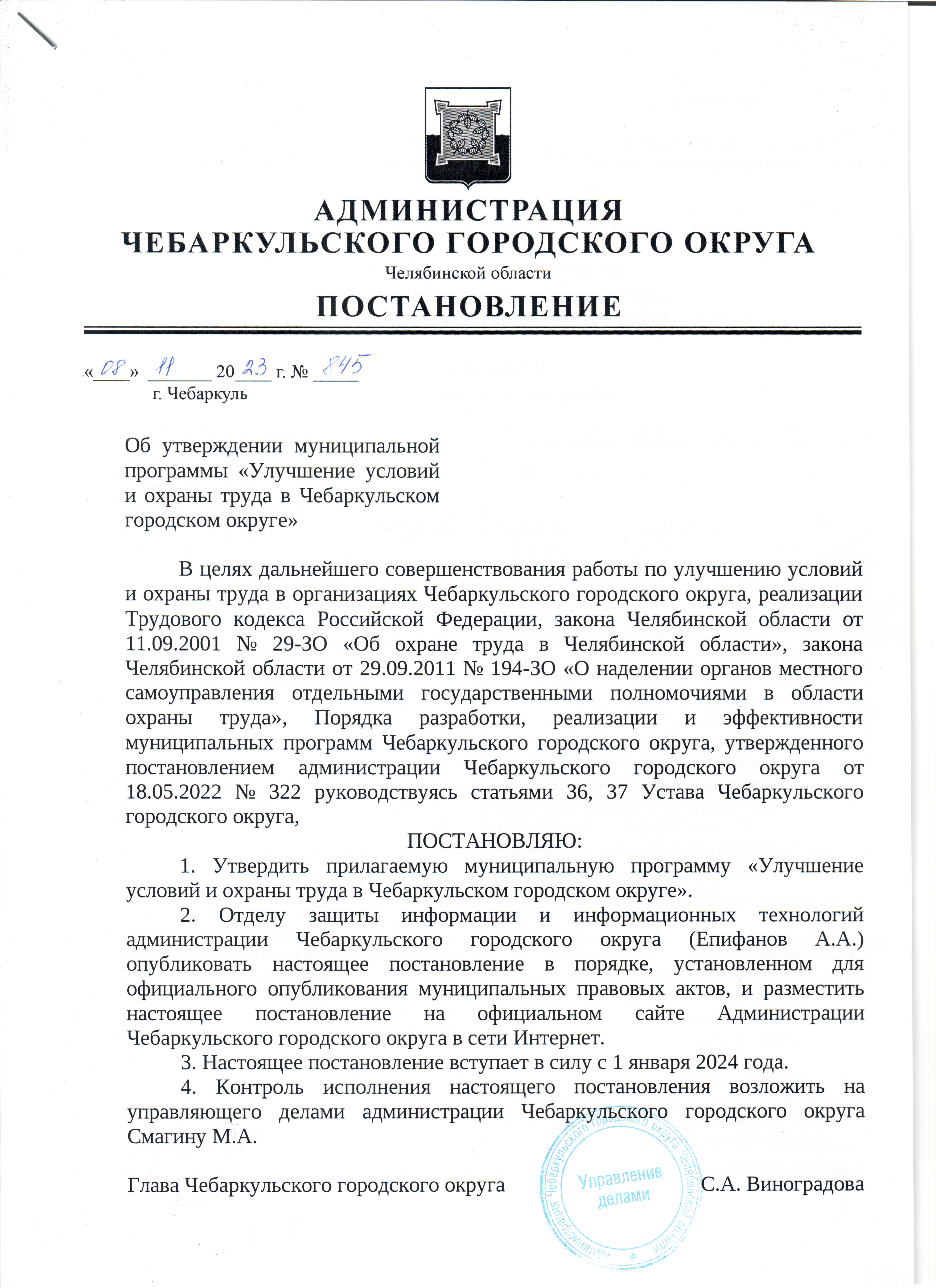 Постановление 08.11.2023 №845 Об утверждении муниципальной программы «Улучшение условий и охраны труда в Чебаркульском городском округе»