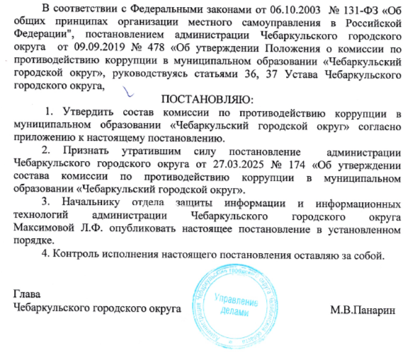 Постановление 04.07.2025 №439 Об утверждении состава комиссии по противодействию коррупции в муниципальном образовании «Чебаркульский городской округ»