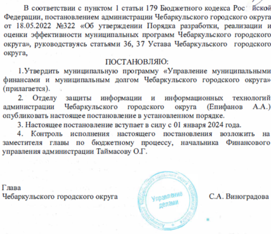 Постановление 09.11.2023 №866 Об утверждении муниципальной программы «Управление муниципальными финансами и муниципальным долгом Чебаркульского городского округа»